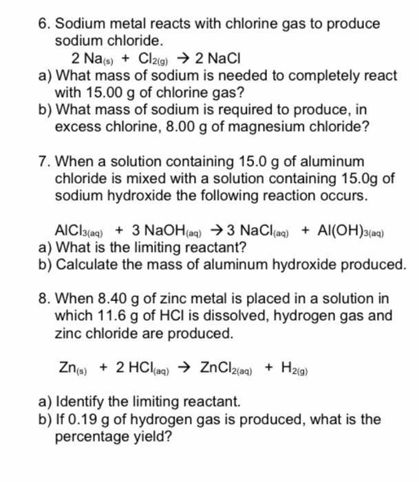 Solved 6. Sodium metal reacts with chlorine gas to produce